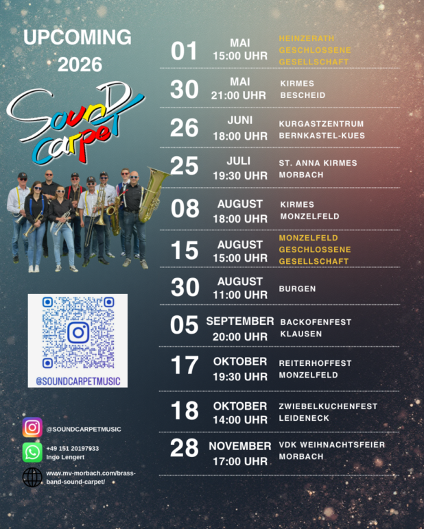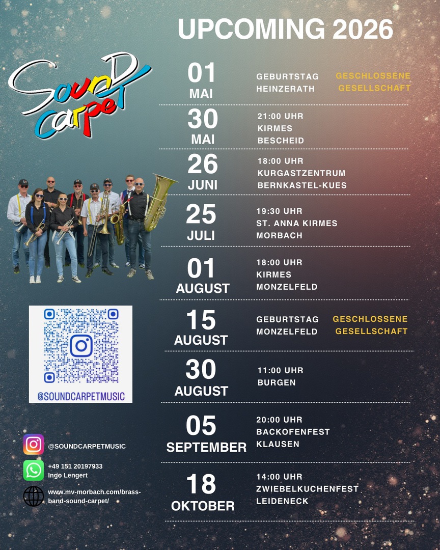 Die Brass Band des Musikvereins Sound Carpet wurde im Jahre 2023 von 9 Musikern gegründet, die ihre Leidenschaft und den Spaß an der Musik teilen.